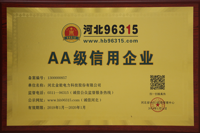 新年的鐘聲剛剛敲響,2018年1月24日,河北金能電力科技股份有限公司就傳來喜訊,公司被河北省96315信用管理中心評為"96315 AA級信用企業(yè)",信用等級再次提升!